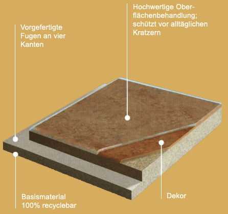 | Caralium Fliese - Der Boden, den Sie mit allen Sinnen genießen könnenAttraktive Designs, wohlige Fußwärme, angenehmer Geräuschkomfort, absolute Wasserunempfindlichkeit, hohe Widerstandsfähigkeit, einfache Pflege und eine große Gestaltungsmöglichkeit. Caralium bietet Ihnen alle Vorteile die Ihnen Ihr zu Hause erst lebenswert machen. Ideal für Renovierungen. Nur 5mm stark, aber ein Bündel an Innovation. Zu 80% besteht Caralium aus KalziumCarbonat, welches warmgepresst mit Harz verdichtet wird. |